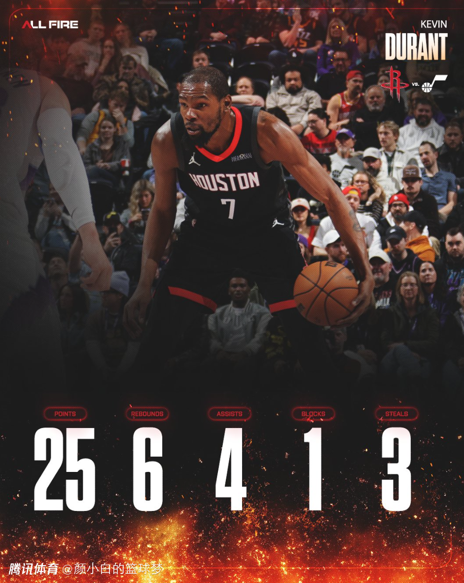 这场比赛火箭一度领先爵士37分之多,这让37岁的杜皇三节早早打卡下班,29分51秒,14中10,三分4中3,罚球2中2,拿到25分6篮板4助攻3抢断1盖帽,命中率71.4%,三分命中率75%,真实命中率高达82.1%,火箭官方写道:好像从未离开。