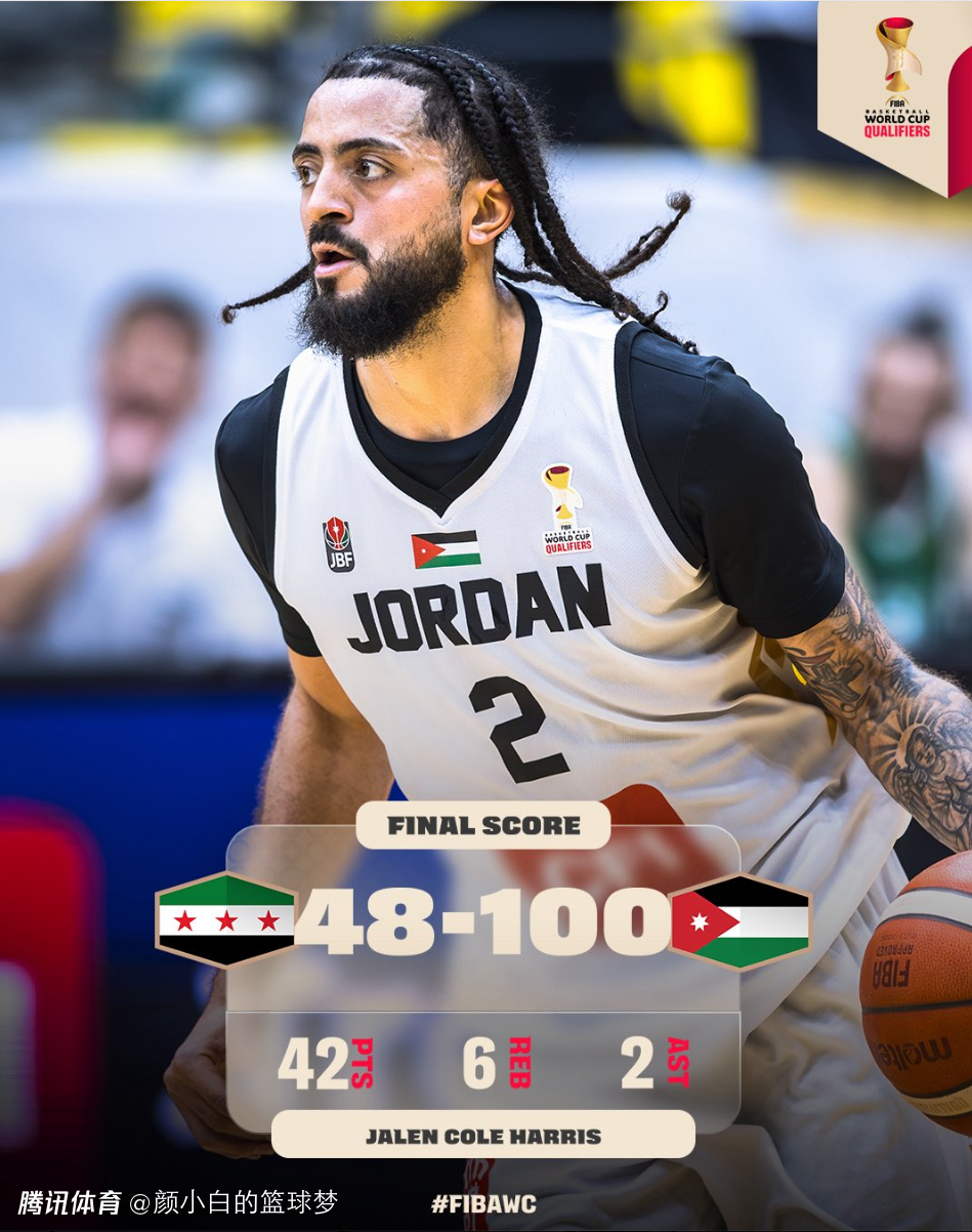 约旦男篮在C组,目前二连胜(+67分)小组第一,他们的净胜分被伊朗还高,帮助约旦男篮拿到这一波二连胜的球员叫做杰伦-哈里斯,他是今年11月约旦男篮刚刚归化的小后卫,哈里斯此前曾效力过CBA南京同曦,本赛季他在新北国王打球是林书豪弟弟林书纬的队友。