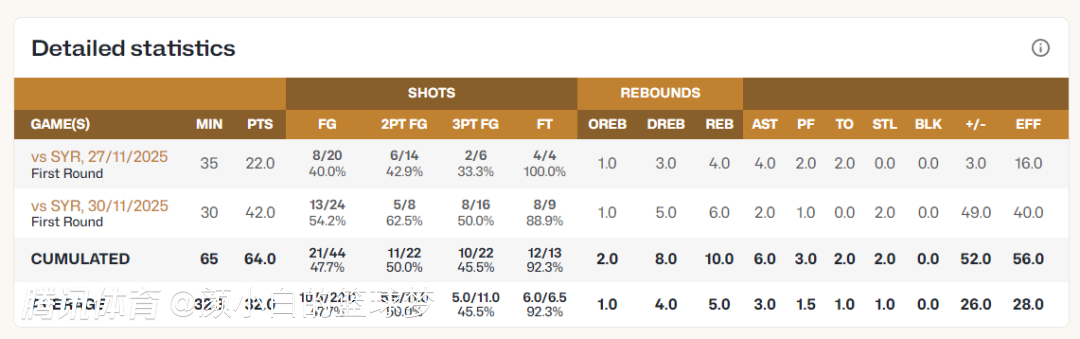 这两场比赛他66分钟,拿到64分10个三分球10篮板6助攻2抢断,命中率47.7%,三分命中率45%,中国男篮看着这种后卫实在是太眼馋了。