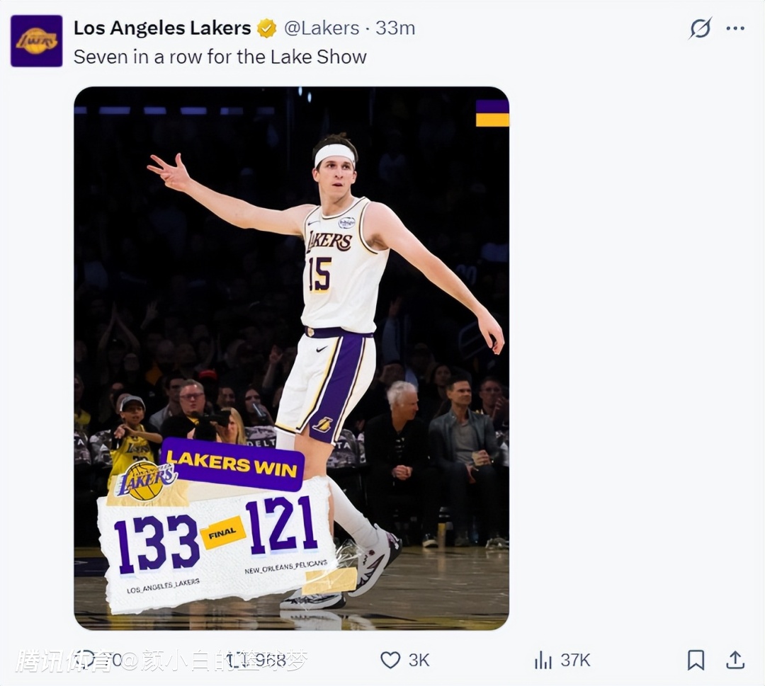 2025-12-01 16:50没有勒布朗-詹姆斯,东契奇、里夫斯联手依旧拿到大胜,这两人又都上20+,对阵鹈鹕与上一场对阵独行侠一样,东皇+里皇两人都上30+,湖人豪取七连胜稳居西部次席,里夫斯本赛季的成长过于喜人。