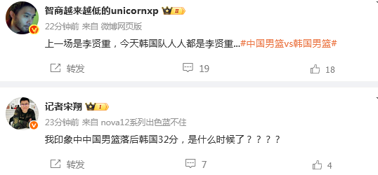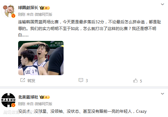 媒体人“球圈赵探长”发文点评:“连输韩国男篮两场比赛,今天更是最多落后32分,不论最后怎么拼命追,都是耻辱的。我们的实力明明不至于如此,怎么就打出了这样的比赛?我还是想不明白”。