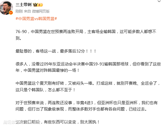 媒体人“三土带刺”发文点评76-90,中国男篮在世预赛两连败开局,主客场全输韩国,这可能多数人都想不到。 最耻辱的,客场这一战,最多落后32分!!! 很多人,没看过09年东亚运动会半决赛中国59-91输韩国那场球,但你看到了这些年,中国男篮对阵韩国最惨的一场! 中国男篮这个夏天刚有好转,又被闷头一棒。打成这样,就别开赛晚、全运会了,这只是个韩国队,怎么都不至于! 对于世预赛来说,两连败还没事,毕竟4进3,但亚洲杯也只是亚洲杯,我们也有问题,但打出了现象级表现,而整体多数对手也都有各自问题,已经过去。 这次窗口期后,有些东西可以变变,别太固执! 【男篮世预赛第一阶段小组赛赛程】 2025年11月28日:中国76-80韩国 2026年3月1日:中国台北vs中国 2026年7月3日:中国vs日本 2026年7月6日:中国vs中国台北