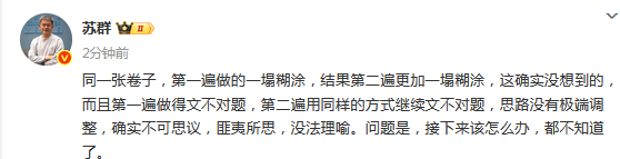 媒体人“苏群”发文点评:“同一张卷子,第一遍做的一塌糊涂,结果第二遍更加一塌糊涂,这确实没想到的,而且第一遍做得文不对题,第二遍用同样的方式继续文不对题,思路没有极端调整,确实不可思议,匪夷所思,没法理喻。问题是,接下来该怎么办,都不知道了。 ”