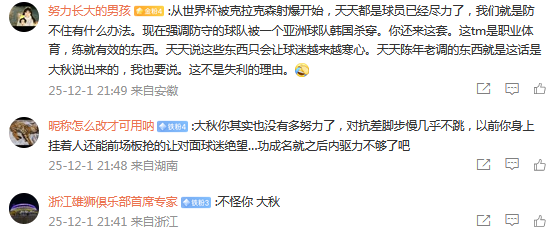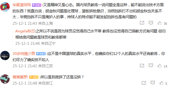 有球迷质疑评论道:又是精神又是心态。国内球员教练一说问题全是这种,能不能说出技术方面的东西?我直白说,胡金秋问题是处理球,篮板拼抢意识,当然挡拆打不出和胡金秋也关系不大,毕竟挡拆不只是掩护人的事,持球人的特点能不能发起挡拆也是有问题的。