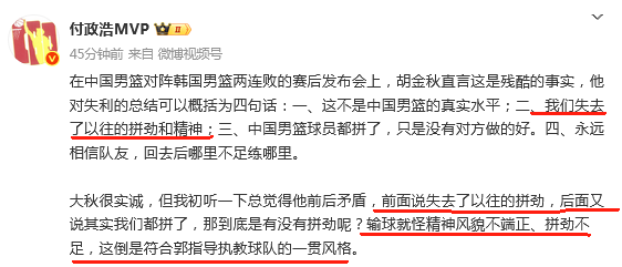媒体人付政浩点评说道:“大秋很实诚,但我初听一下总觉得他前后矛盾,前面说失去了以往的拼劲,后面又说其实我们都拼了,那到底是有没有拼劲呢?输球就怪精神风貌不端正、拼劲不足,这倒是符合郭指导执教球队的一贯风格。”