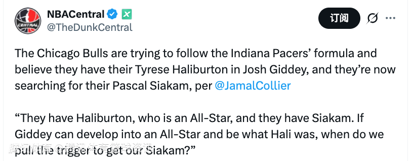 2025-12-02 00:50北京时间12月2日,据ESPN记者Jamal Collier报道,公牛队正试图效仿步行者队的建队模式,他们认为吉迪就是自己的“哈利伯顿”,目前正在寻找属于自己的“西亚卡姆”。