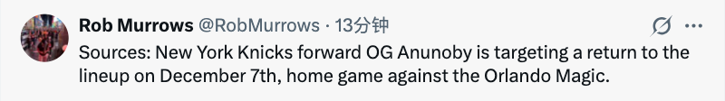 2025-12-02 01:00北京时间12月2日,据美记Rob Murrows报道,尼克斯前锋阿奴诺比计划在12月8日主场对阵魔术的比赛中迎来复出。