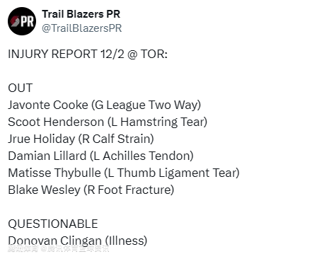 确定缺阵:贾冯特-库克(G联盟双向合同)、斯库特-亨德森(左腘绳肌撕裂)、霍勒迪(右小腿拉伤)、利拉德(左跟腱伤势)、赛布尔(左拇指韧带撕裂)、布莱克-韦斯利(右足部骨折)
