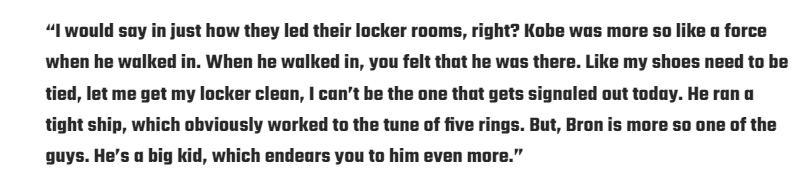 小南斯说道:“我想说的是他们管理更衣室的方式,对吧?科比一走进更衣室,就自带一种强大的气场。他一出现,你就会立刻意识到他的存在,比如‘我得把鞋带系好’‘得把储物柜收拾干净’‘今天可不能成为被他点名批评的人’。他把球队管理得纪律严明,显然这种方式很奏效,帮他赢下了5枚总冠军戒指。而勒布朗则更像‘兄弟中的一员’,他就像个大男孩,这让大家更愿意亲近他。”