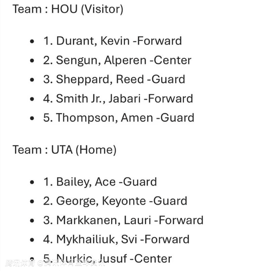 火箭首发阵容为:杜兰特、申京、谢泼德、小贾巴里-史密斯、阿门-汤普森
