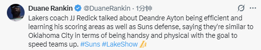 在谈到太阳队的打法时,雷迪克表示:“他们很擅长造失误,防守很有侵略性,所以这场比赛的关键是别失误。像太阳和雷霆这种球队,他们会用身体接触来施压,让你着急乱打,所以我们必须要找到应对压迫防守的办法。”