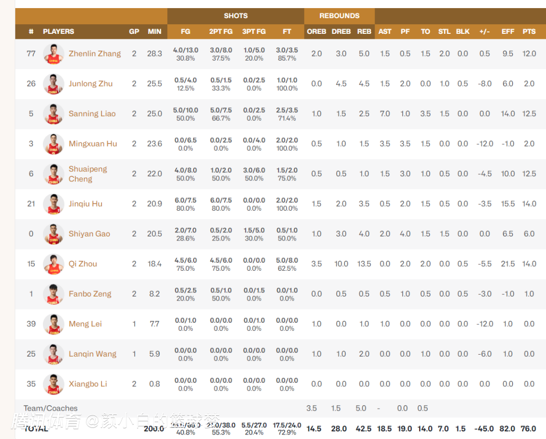 两场比赛结束,男篮命中率在50%以上的球员只有廖三宁、胡金秋、周琦、程帅澎,场均得分上双的只有:廖三宁、张镇麟、周琦、胡金秋、程帅澎。高诗岩、胡明轩两个后卫表现非常之差,胡明轩承受了更多的批判压力。