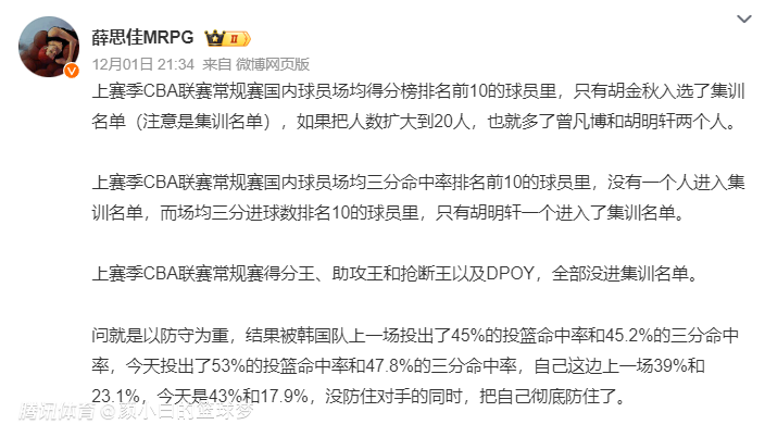 薛思佳是质疑郭士强的选手,上赛季CBBA国内球员得分榜前十只有胡金秋入选集训队,扩大到20人也只多了曾凡博、胡金秋。上赛季CBBA国内场均三分命中率排名前十没有一人入选集训队。上赛季CBA得分王、助攻王、抢断王、DPO全都没进集训队,以防守为主的男篮让韩国投出了超高的命中率与三分命中率。