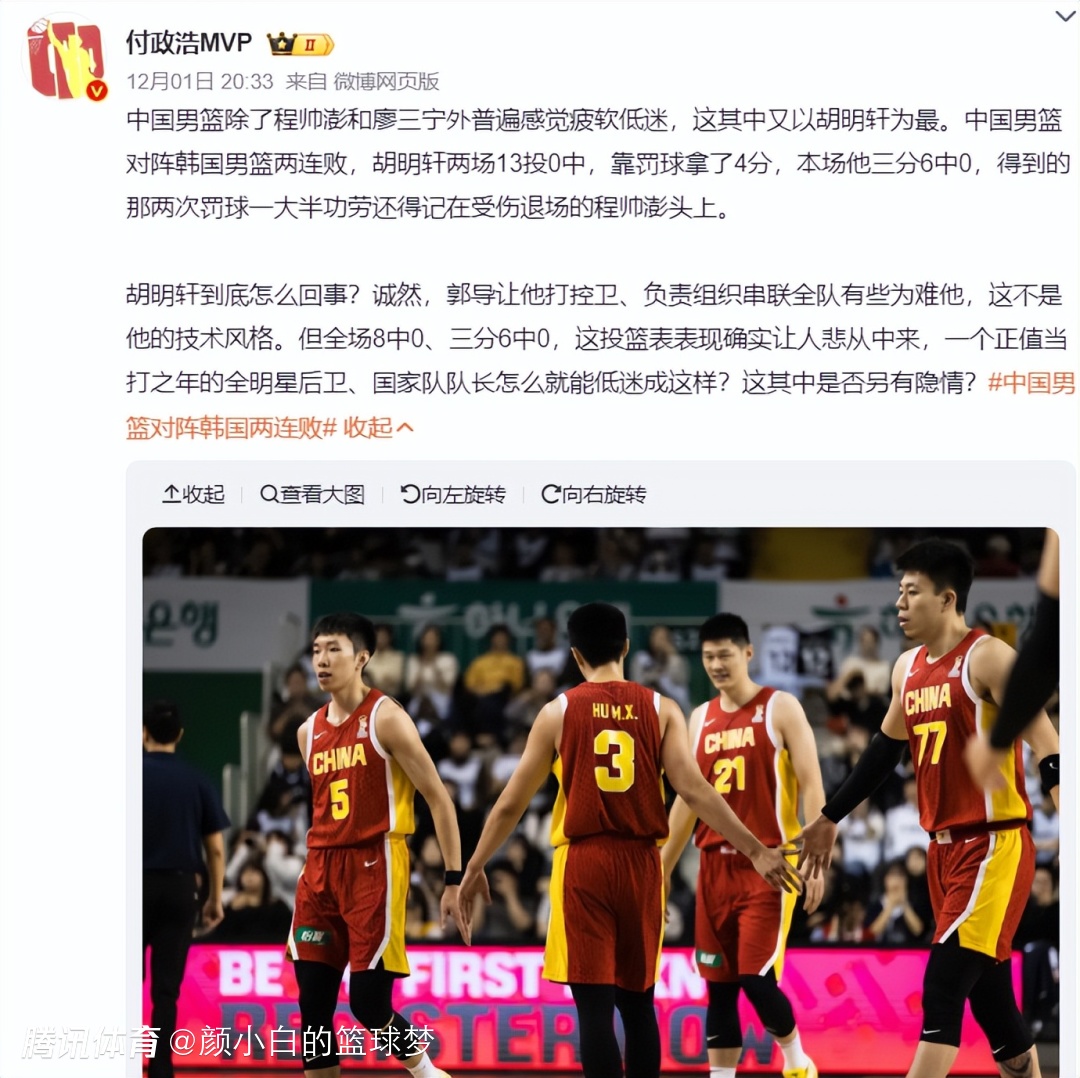 付政浩:胡明轩有伤在身吗?防守跟不上韩国脚步,进攻发挥不了作用,胡明轩是技术最全面的后卫,怎么打韩国如此吃瘪?最近三次打韩国胡明轩是19中0。