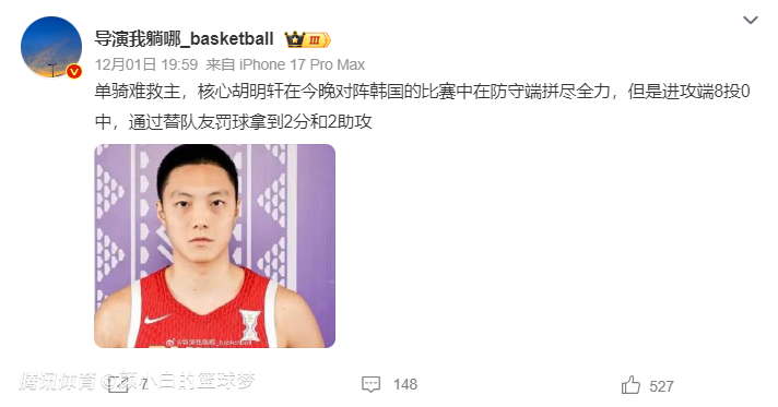 导演更是对胡明轩进行了冷嘲热讽,说他8中0单骑难救主。