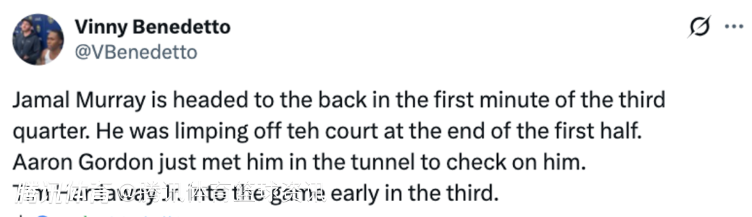 2025-12-02 11:40北京时间12月2日,NBA常规赛,掘金主场对阵独行侠,贾马尔-穆雷在第三节比赛刚开始不久,就被小哈达威换下场。其实早在上半场结束的时候,穆雷就一瘸一拐地返回更衣室。据最新消息,穆雷已经重新回到赛场。