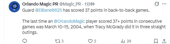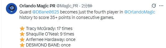 根据数据统计显示,在魔术队历史上,上一位能连续两场比赛砍下至少37分的球员是21年的前的麦迪。而如果把数据放宽至连续两场35+,魔术队历史上总计有4名球员曾做到这点,分别是麦迪(17次)、奥尼尔(9次)、安芬尼-哈达威(1次)和贝恩(1次)。