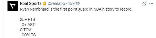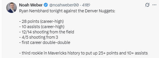 独行侠后卫莱恩-内姆布哈德此役发挥出色,他得到28分10助攻且0失误,28分和10助攻均创内姆布哈德生涯新高,这也是他职业生涯首次砍下两双。此外,根据数据统计显示,内姆布哈德还是NBA历史上首位能以100%真实命中率砍下至少25分10助攻且0失误的控球后卫,他还是独行侠队历史上第3位能单场砍下至少25分10助攻的新秀球员。内姆布哈德此役没有获得罚球,上一位能0罚球砍下至少25分10助攻的新秀球员是他的哥哥,步行者控卫安德鲁-内姆布哈德。