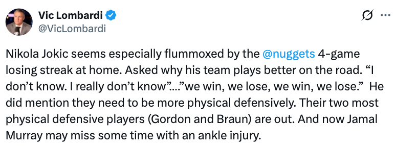 另外约基奇也提到球队在防守端需要更有对抗性,然而队里最具对抗性的两位防守球员(戈登和布劳恩)目前都缺阵了。