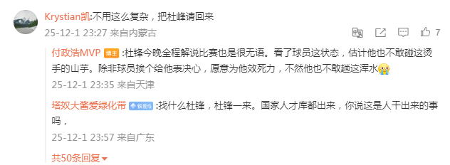 2025-12-02 20:30中国男篮世预赛被韩国队双杀后,有网友表示让男篮走出泥潭的办法是请回杜锋执教。对此,媒体人付政浩的看法是杜锋不敢轻易趟这浑水。