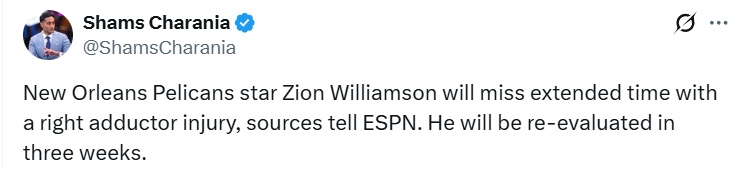 赛季至今,锡安场均22.1分5.6篮板4助攻,投篮命中率51%,他出场也是打打停停。开季打完两场,休战一场,接着打了三场,又连续休战八场,再打两场,又休一场,随后复出再战三场,继续休战……如今Shams的爆料,意味着锡安又要开启长期休战的模式。需要注意的是三周后复查,不代表着三周后就能复出。他是至少要缺席三周的比赛。