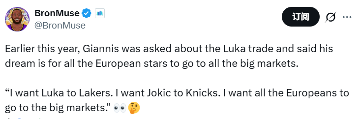 另外,字母哥在东契奇被交易到湖人时的言论被扒出,当时他说道:“我希望东契奇能去湖人,希望约基奇能去尼克斯,我希望所有欧洲球员都能加盟大球市球队。”如今回顾这段言论,这或许也暗示着自己想去大市场球队。