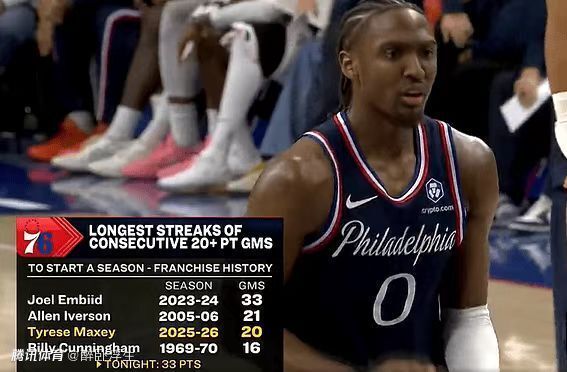 马克西迎来给力表现,他第三节狂轰20分,且已经连续20场得分20+位列队史第三位,仅次于恩比德连续33场与艾弗森连续21场。