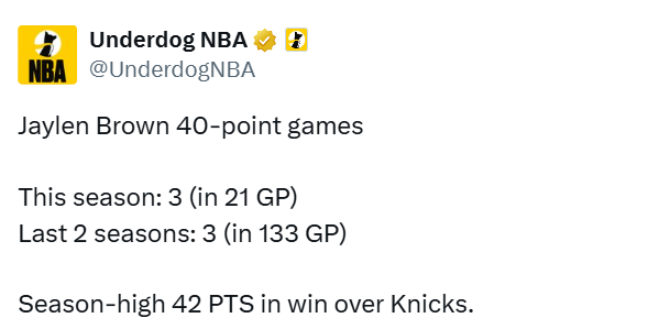 根据数据统计显示,杰伦-布朗近三个40+得分场次达到6场,其中本赛季3场(出战21场),过去2个赛季3场(出战133场),而本赛季最高分42分正是来自本场击败尼克斯的比赛。