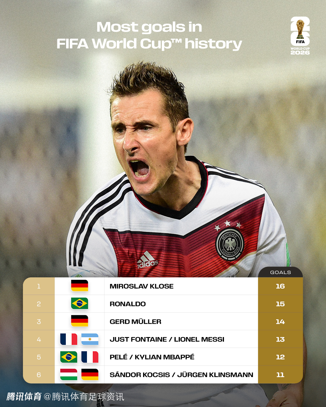 世界杯历史射手榜发布:克洛泽16球居首 现役仅梅西与姆巴佩在列