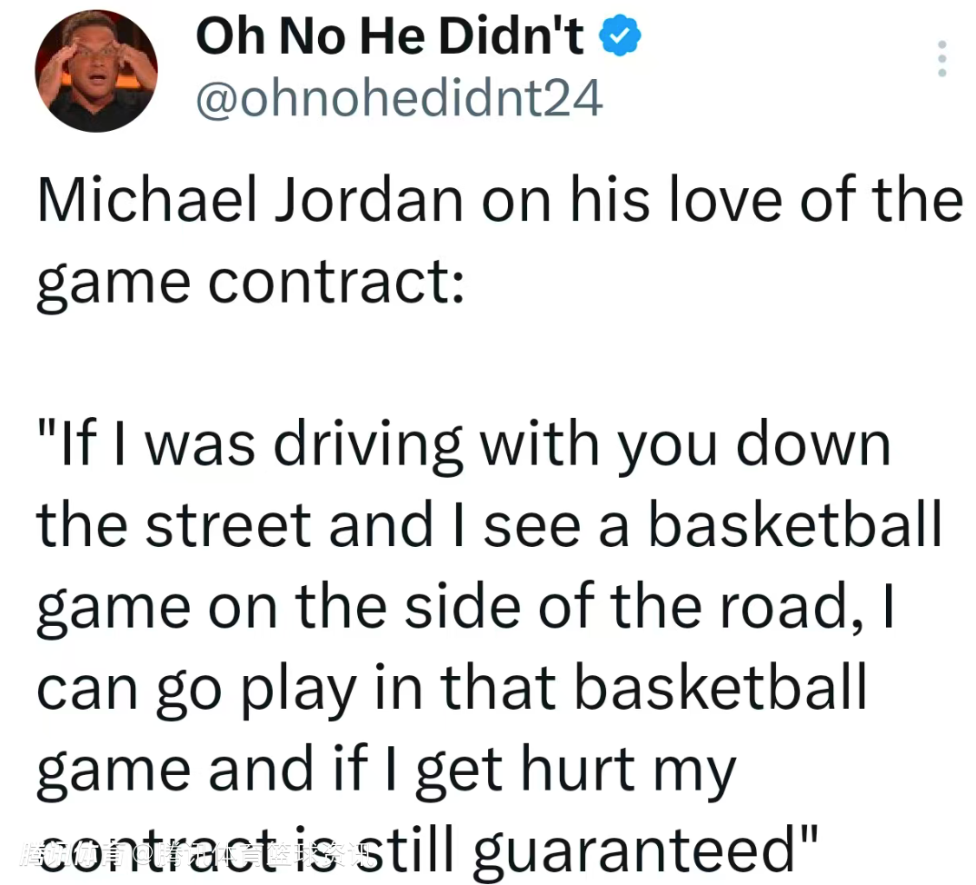乔丹表示:“要是我和你开车在路上,看到路边有人打球,我可以直接下场参与,就算受伤,我的合同依然受保障。”