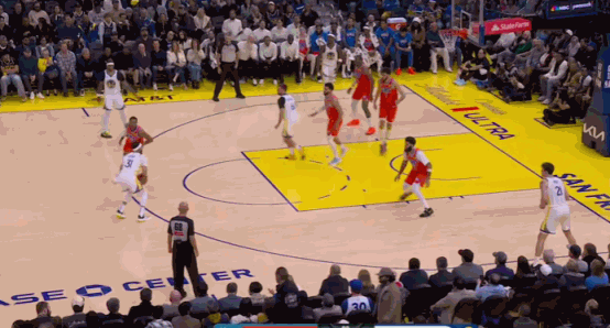 首节比赛,小库里并未出战,不过在第二节被替换上场后,他也抓住机会证明了自己,在第二节还剩下8分多钟的时候,小库里持球,完成了一个高难度的压哨后撤步中距离,拿到了自己勇士生涯首分,而在之后的进攻回合,小库里接到小佩顿的传球,命中了一记三分球,帮助勇士将分差缩小至个位数。但是亚历山大上半场结束前爆发,一人连拿8分,再次拉开分差。