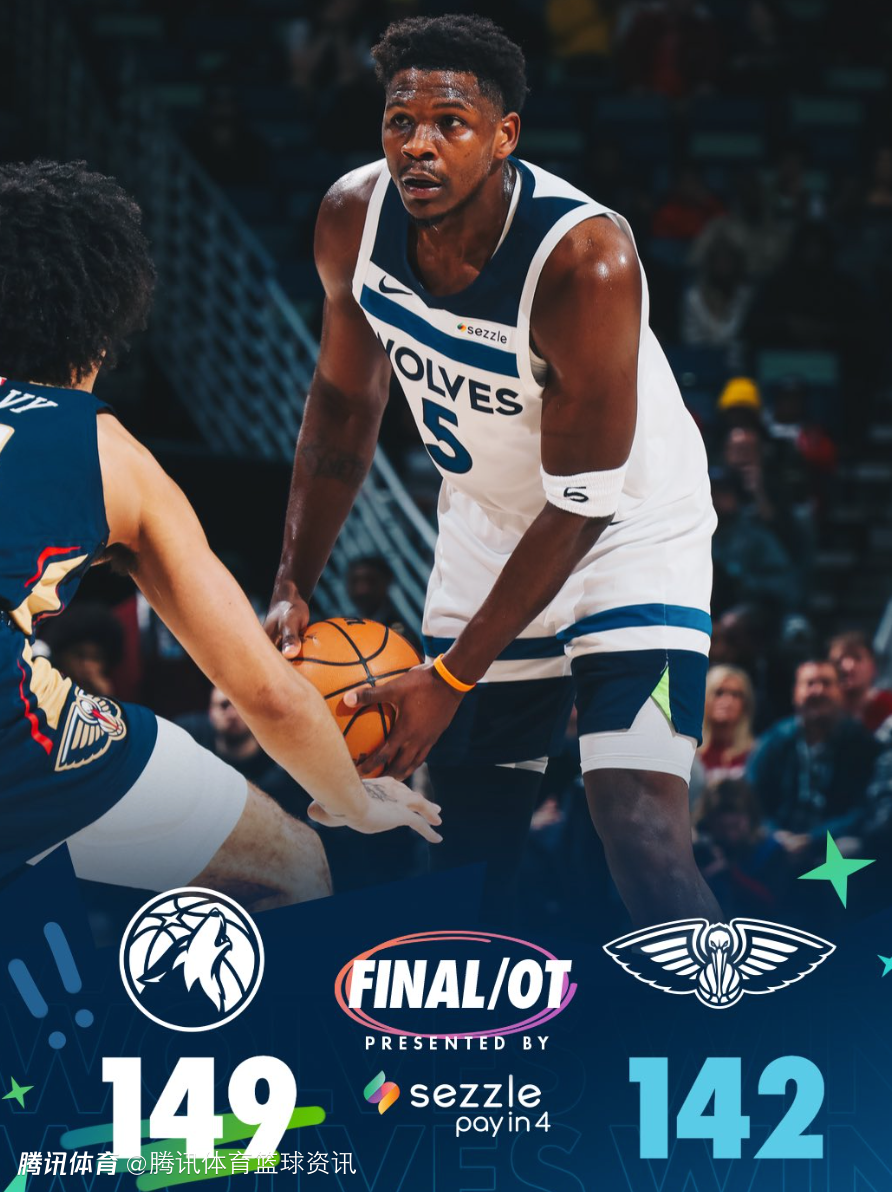 2025-12-03 14:20北京时间12月3日,NBA常规赛,森林狼通过加时赛,以149-142击败鹈鹕,取得三连胜,此役爱德华兹拿到全队最高的44分。