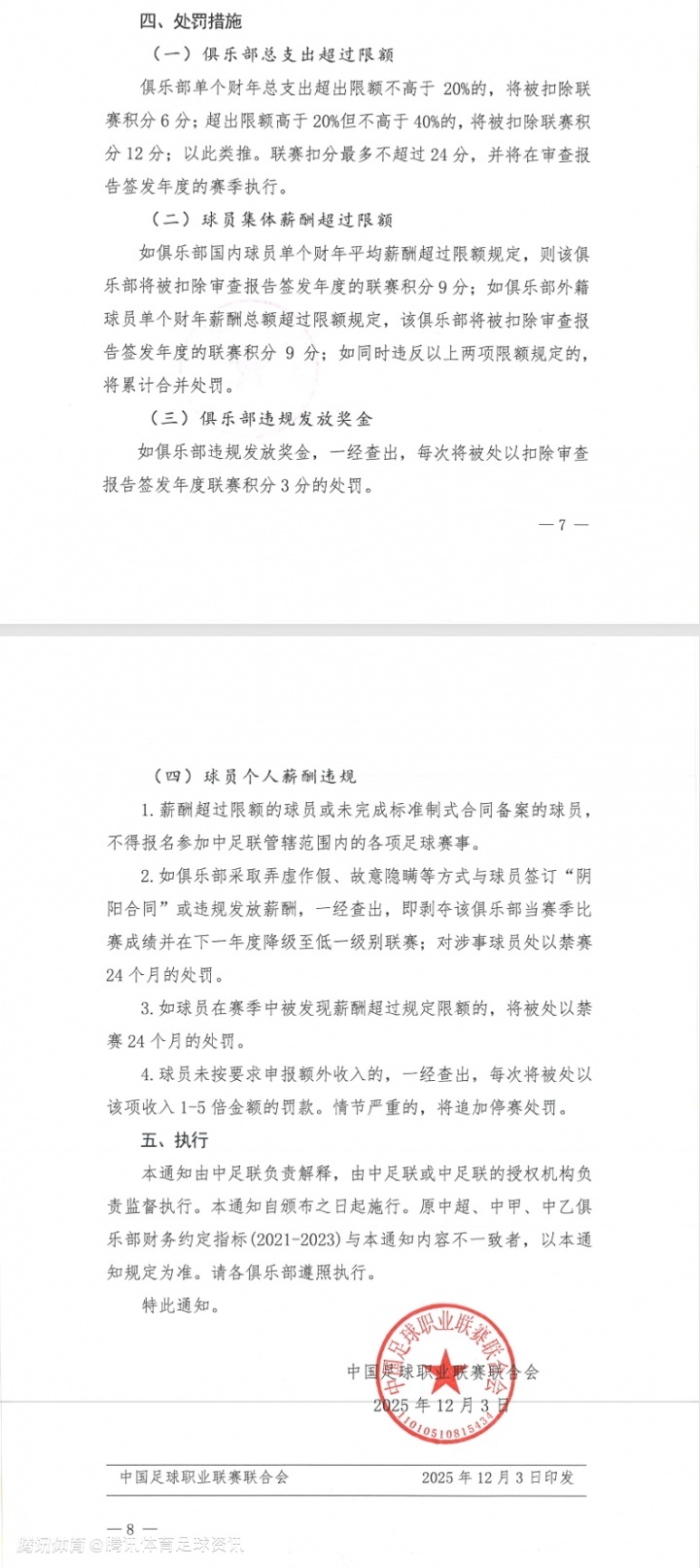 2025-12-03 15:40北京时间12月3日,中足联今日正式发布《中国足球职业联赛俱乐部财务约定指标的通知》,同步公布了各类财务违规的处罚细则,涵盖总支出、球员薪酬、奖金以及“阴阳合同”等热点问题。