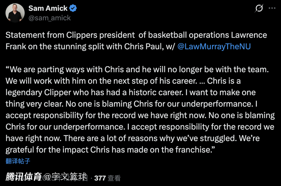 随后快船篮球运营总裁劳伦斯-弗兰克就与克里斯-保罗令人震惊的分道扬镳发表声明: