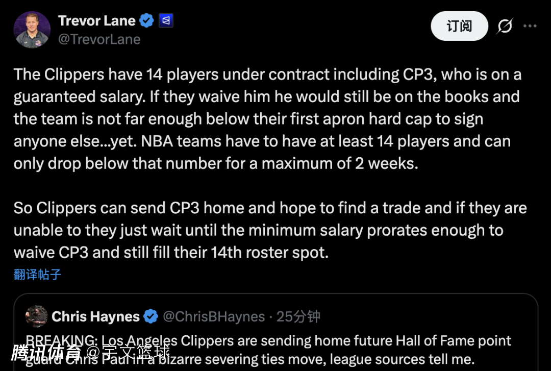 据记者Trevor Lane报道,快船目前有14名球员在合同期内,其中包括保罗,他的薪水是保障性的。即使快船选择裁掉保罗,他仍然会留在球队的账上,而且球队目前的薪资总额还未低于第一轮工资帽,所以暂时还不能签下其他球员。