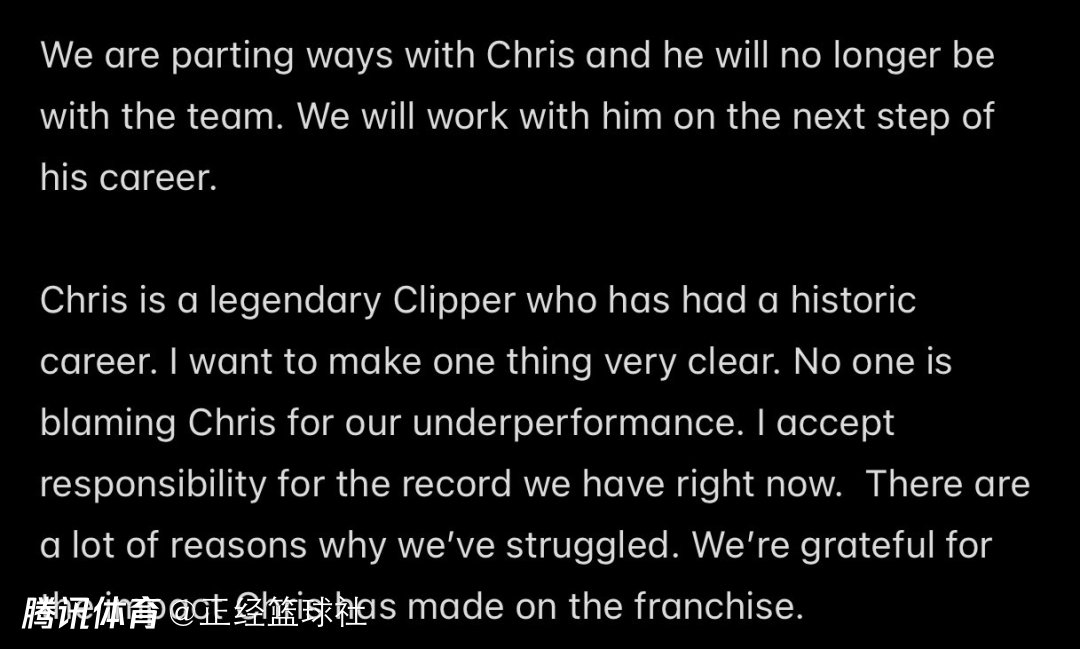 快船队官方宣布:我们正在与保罗分道扬镳,他将不再继续与球队共事。我们将继续与他合作,支持他在职业生涯的下一步发展。保罗是一位传奇的快船球员,他的职业生涯具有历史意义!我们想澄清一点,没有人因为我们的表现欠佳而责怪他。我们每个人都对我们目前的战绩负有责任。我们之所以遇到困难有很多原因,我们很感激保罗对球队所产生的影响。