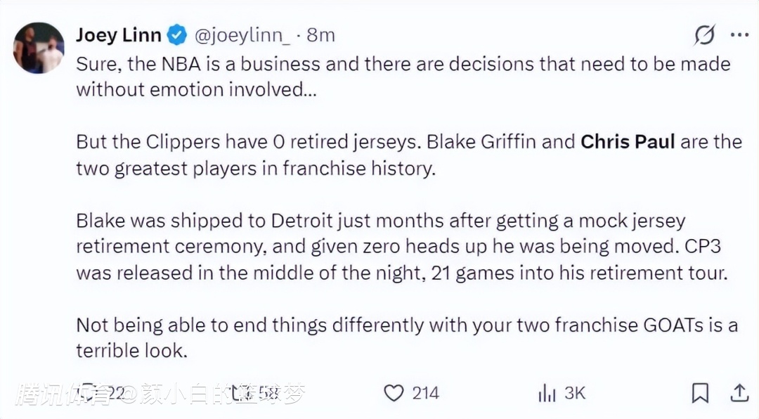 快船记者Joey Linn写道:NBA是商业联赛,有些决策不需要带有个人情感,快船队史甚至还没有退役过球衣,格里芬、保罗都是快船队史最出色的球员,他们都明确表态愿意在快船退役,可快船管理层都对他们进行了清理,交易格里芬,裁掉保罗,我无法认同快船的行为,他们对两位球队代言人的道别非常糟糕。