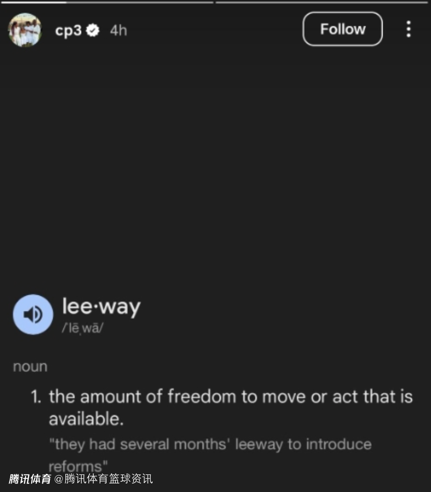据快船队记劳-穆雷报道,在球队客场之旅前,保罗曾在Instagram发布《牛津词典》中“leeway”一词的释义截图,暗示快船队内存在缺乏责任感的问题,这可能就是此次事件的导火索。如今,快船和保罗都将权衡后续选择:保罗的合同为一年期,球队可在12月15日后将其交易。