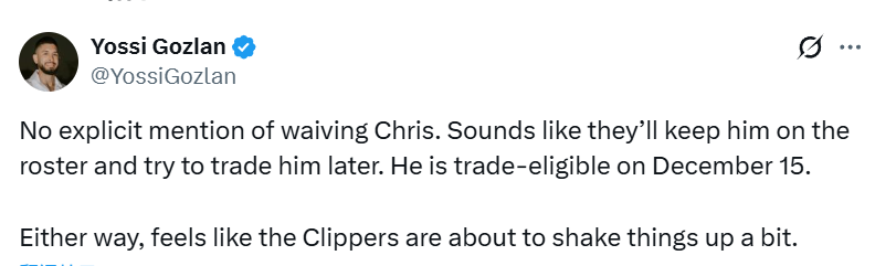 薪金专家戈兹兰指出,快船在官宣这一劲爆消息的声明中,并未提及“裁掉保罗”的相关表述。“声明里没明确说要裁克里斯,听着像是他们会先把他留在阵容名单里,之后再尝试交易。他12月16日就能被交易了。不管怎样,快船这是要开始搞点大变动了。”