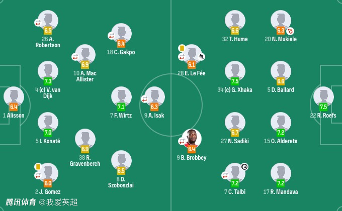 利物浦首发:1-阿利松、2-戈麦斯(65'17-琼斯)、4-范戴克、5-科纳特、26-罗伯逊(86'6-科尔克兹)、7-维尔茨、8-索博斯洛伊、10-麦卡利斯特(74'22-埃基蒂克)、38-赫拉芬贝赫、9-伊萨克(86'14-基耶萨)、18-加克波(46'11-萨拉赫)