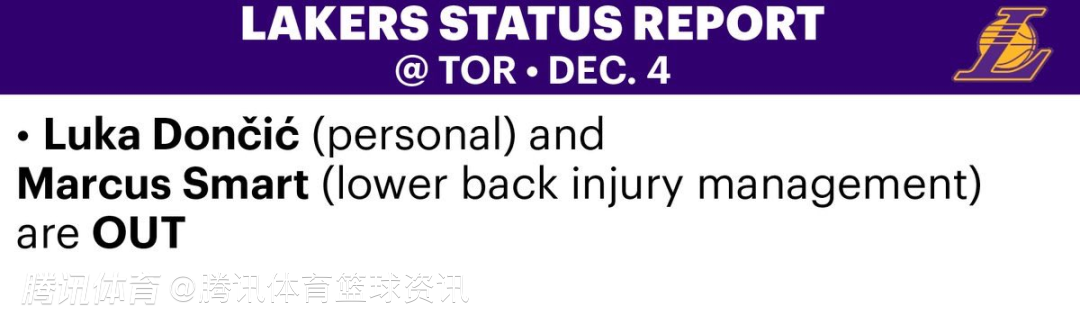 2025-12-04 06:50北京时间12月4日,NBA常规赛继续进行,湖人明日将对阵猛龙。赛前,湖人方面公布本场比赛伤情报告,东契奇(个人原因)、斯马特(下背部伤势管理)将缺席本场比赛。
