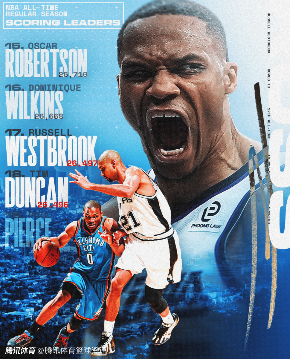 第二节比赛,威少空切迅速弹起,空中点篮命中,让自己的生涯总得分超越邓肯,升至历史第17位。本场比赛之前,威少的生涯总得分为26490分,在超越邓肯后,威少将追逐排在第16位的威尔金斯(26668分),现役球员中,仅有哈登、杜兰特、詹姆斯的总得分比他更多。