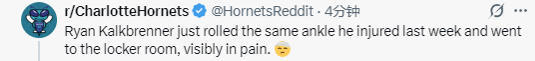 2025-12-04 11:00北京时间12月4日,NBA常规赛继续进行,黄蜂队对阵尼克斯队。在第四节比赛中,黄蜂队球员卡尔克布伦纳在封盖对手时与对手相撞,导致脚踝扭伤,随后他返回更衣室。
