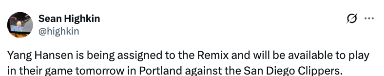 2025-12-04 11:30北京时间12月4日,稍早前结束的一场NBA常规赛,开拓者在客场以122-110击败骑士,本场比赛杨瀚森只打了第一节,拿到2分1篮板1助攻1盖帽,后三节并未出战。赛后据开拓者队记Sean Highkin报道,杨瀚森被下放至G联盟混音队,可以出战明日对阵圣迭戈快船的比赛。