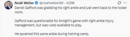 值得一提的是,此前,加福德因右脚踝伤病管理问题,本场比赛的出战状态被列为出战成疑的状态,但最终被确定可以上场。而在训练营期间,加福德就曾扭伤过同一只脚踝。
