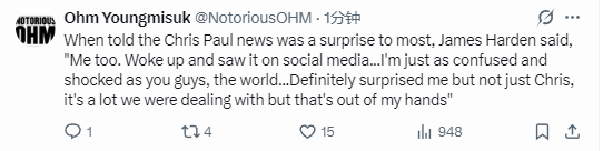 哈登表示:“我也一样很意外。醒来后在社交媒体上看到了这件事,我和你们、和所有人一样困惑又震惊。这事儿确实让我很意外,但不只是克里斯的问题,我们这段时间其实要处理很多事,只是这些都不是我能掌控的。”