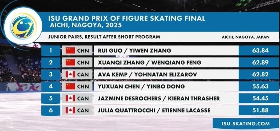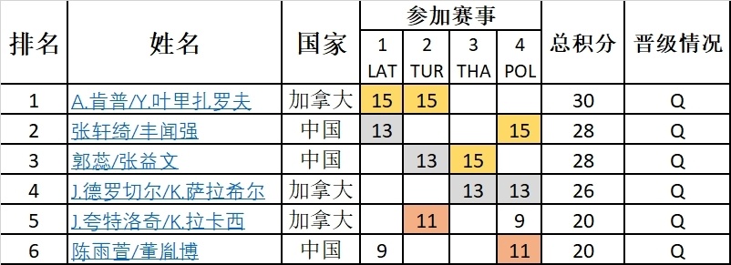 在青年组大奖赛分站赛之后,共有6对组合晋级总决赛:中国和加拿大各三对,呈现分庭抗礼之势。