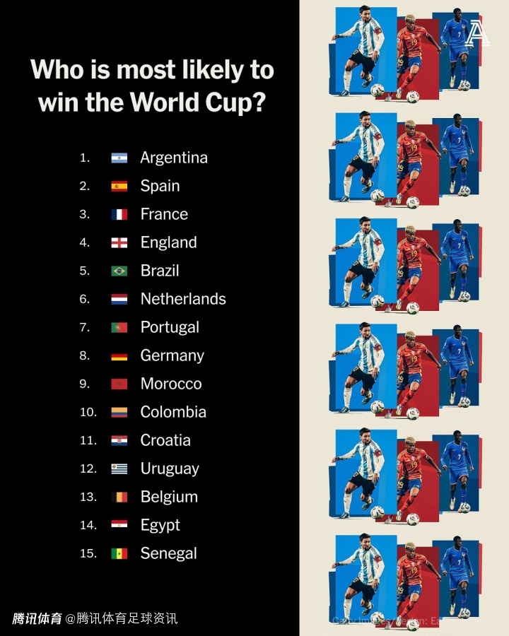 TA在文中写道,抽签将正式拉开明年世界杯的序幕,现在正是重新审视各队夺冠可能性的最佳时机。本次排名考虑了全部潜在参赛队,包括: