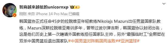 Mazurs深耕拉脱维亚青训多年,曾带过波尔津吉斯,韩国篮协以封闭出名,这是他们历史上第一次聘请外国教练担任国家队主帅,另外“最强临时工”全熙哲在双杀中国男篮后退出国家队。