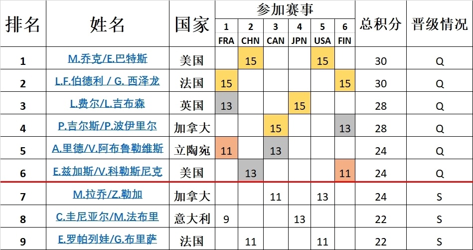 经过分站赛的比拼,共有以下6对组合晋级总决赛